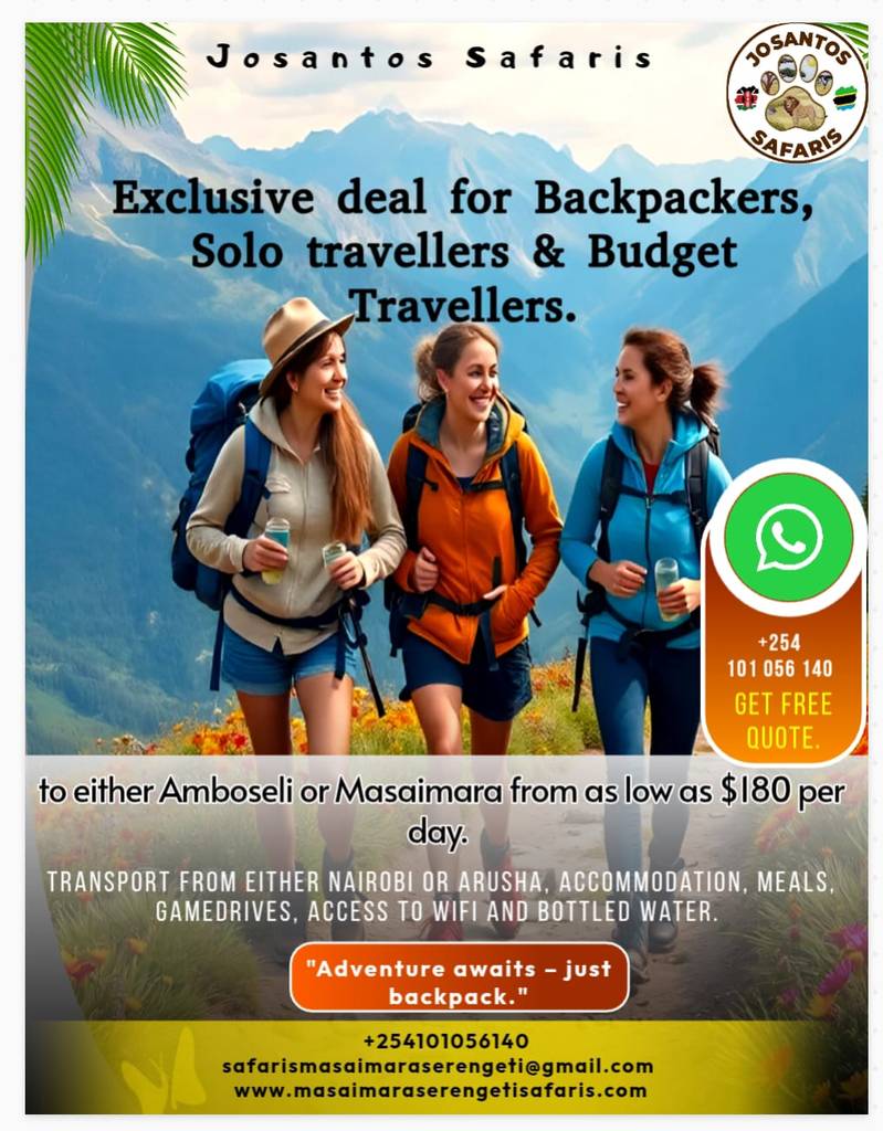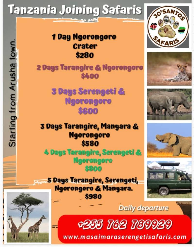 Josantos Safaris Masaimara Serengeti Safaris "Experience the Best Kenya & Tanzania Safaris | Authentic Wildlife Adventures with Josantos Safaris" Explore Kenya and Tanzania with Josantos Safaris. Welcome to Josantos Safaris, also known as Masai Mara Serengeti Safaris where adventure meets expertise! Founded and led by Jose', who boasts over 14 years of experience in guiding and managing safari experiences across East Africa, we are your trusted partner for unforgettable wildlife adventures. The passion for wildlife and the African parks like Masai Mara, Lake Nakuru, Lake Naivasha, Tsavo East, Tsavo West, Amboseli, Serengeti, Tarangire, Lake Manyara, Ngorongoro crater has driven him to create a safari company that prioritizes quality and attention to detail. With extensive knowledge of East Africa’s most breathtaking destinations, he ensures that every trip is not just a journey but an experience of a lifetime. Our Mission At Josantos Safaris, our mission is to provide exceptional safari experiences that cater to the unique desires of each traveler. We are devoted to responsible tourism, supporting local communities and wildlife conservation efforts while delivering unforgettable adventures. Why Choose Josantos Safaris? Expertise You Can Trust: With Jose at the helm, our team combines years of experience with a deep understanding of East Africa’s wildlife and ecosystems, ensuring an enriching safari experience. Locations: Our offices are strategically located in Nairobi, Wote Town, and Arusha, making it easy for travelers to connect with us and plan their dream safari. Personalized Itineraries: We pride ourselves on our keen attention to detail and professionalism, crafting tailored safari packages that meet your specific interests, whether it’s thrilling game drives, cultural experiences, or luxury accommodations. Positive Reviews: Our commitment to excellence has earned us numerous positive reviews from satisfied travelers, highlighting our dedication to providing memorable and immersive experiences. Our Safari Packages Explore our diverse range of safari packages, including: Wildlife Safaris: Witness the majesty of the Big Five in their natural habitat. Cultural Experiences: Engage with local communities and discover rich traditions. Adventure Tours: Experience the thrill of walking safaris and hot-air balloon rides. Josantos Safaris prides itself on 24-hour customer service with instant responses via WhatsApp, WeChat, email, and social media, ensuring smooth communication and booking processes. we caters to diverse travelers, including families, solo adventurers, students safaris, people with disabilities (PWD), and private groups, offering luxury and budget-friendly options. As a member of the Makueni Hospitality Association, Josantos Safaris supports sustainable tourism and community involvement with our Pad Per Girl Initiative contributing positively to conservation and local livelihoods. Whether you seek the thrilling Big Five sightings, the Great Migration, birdwatching, or cultural immersions, Josantos Safaris guarantees a unique and authentic East African safari experience.